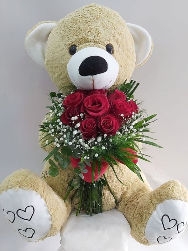 PELUŞ AYICIK KUÇAĞINA HAZIRLANMIŞ 10 ADET GÜL ARAJMANI